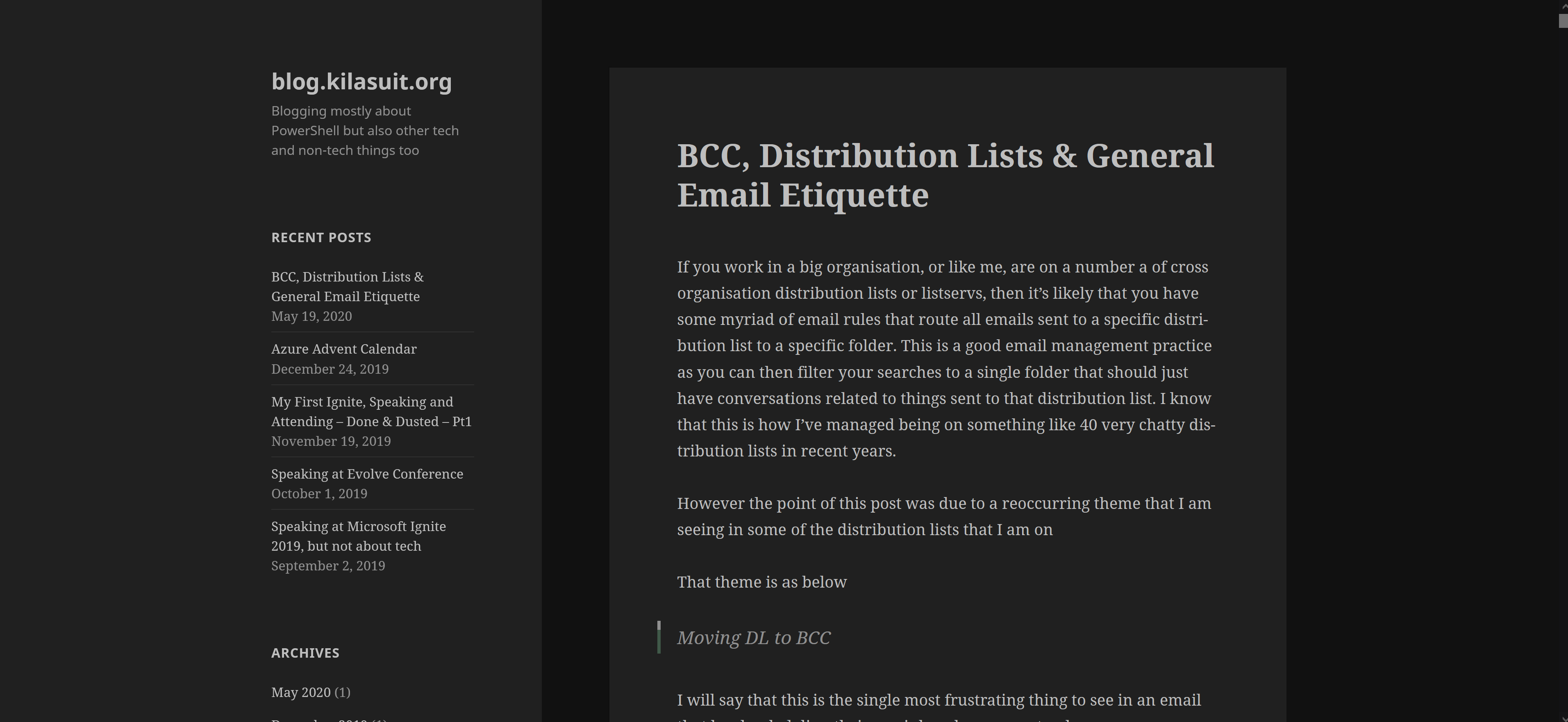 This time I re-platformed the blog entirely away from Wordpress (well Project Nami) to Hugo and Azure Static Sites. I still get a small amount of info from Azure Static Sites, it isn’t to the same level as Wordpress holds, which is what I want right now as I’m not really fussed about page counts or where people are viewing from even though those metrics would be good for measuring the level of impact that my blog has, though that’s not why I blog.